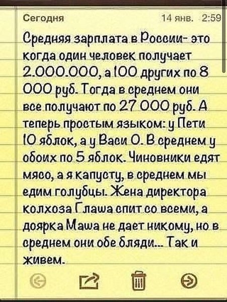Так они так и считают! Зарплата монтёра пути 20 тысяч, а начальника 100, а средняя по отрасли получается 60!