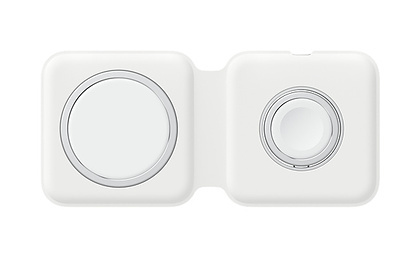 Двойное зарядное устройство MagSafe предназначено для одновременной зарядки iPhone и часов Apple Watch. Зарядка происходит по беспроводному стандарту. Аксессуар состоит из двух половин, на каждой из которых расположена индукционная катушка. Согласно описанию, устройство может заряжать смартфон с максимальной мощностью до 14 ватт, часы — до 11 ватт. При этом нужно подключать аксессуар к адаптеру питания мощностью от 20 ватт.