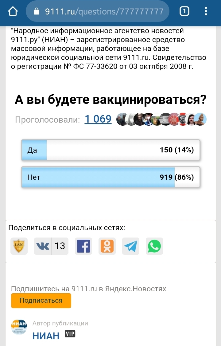 Елена, не может быть вакцина БЕЗвредной! Да ещё та,что не прошла испытания по времени. Это уничтожение старых, больных и уязвимых. Хочу призвать всех, кто против --- выходите на пикеты и митинги, показывая своё НЕжелание быть отравленным!