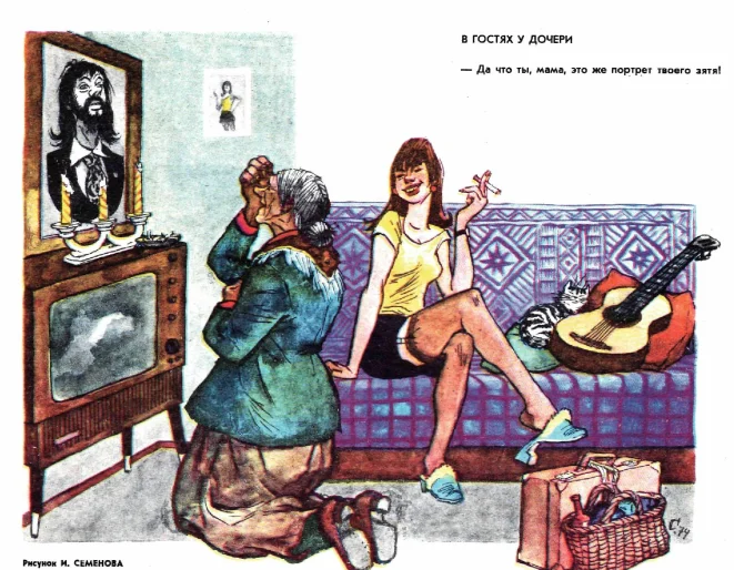 Очень интересная картинка. Мама из деревни приехала навестить замужнюю дочь. Привезла с собой гостинцы - настоящие деревенские продукты в корзине, наливочка, что-то там еще. Дочь у мамы настолько модная, что из-под юбки виден ее чулок. Мама бахнулась перед фото на стене - не иначе, как с Христом перепутала.