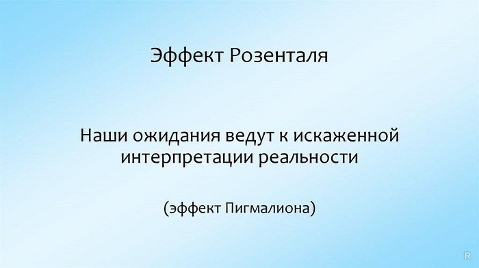 Чтобы стало совсем понятно, что я имею в виду, приведу пример, так называемого, эффекта Розенталя (эффекта Пигмалиона). А состоит он в том, что человек, который твердо убежден в верности какой-то информации, сам не замечая того, выстраивает собственные действия таким образом, что получает фактическое подтверждение этой информации. Другими словами, качество наших ожиданий влияет на результаты наших действий. Это интересное явление, которое можно назвать, как «самоисполняющееся» пророчество, наблюдал и тщательно изучал американский психолог Роберт Розенталь.