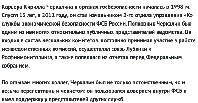 Чуть более года назад стало известно, что начальник банковского отдела управления «К» ФСБ России Кирилл Черкалин, которого задержали в апреле прошлого года, получал миллионные взятки прямо на Лубянке возле штаб-квартиры спецслужбы (!). Подробнее ➤