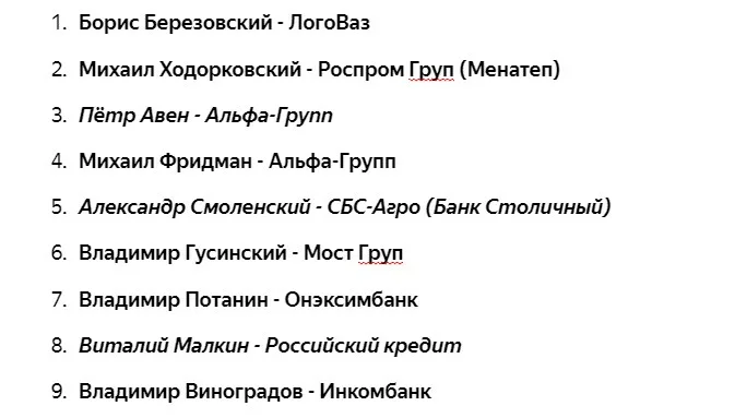 Эти люди владели не только финансами страны, но и средствами массовой информации, а также от них полностью зависели политические решения, которые принимало правительство РФ.