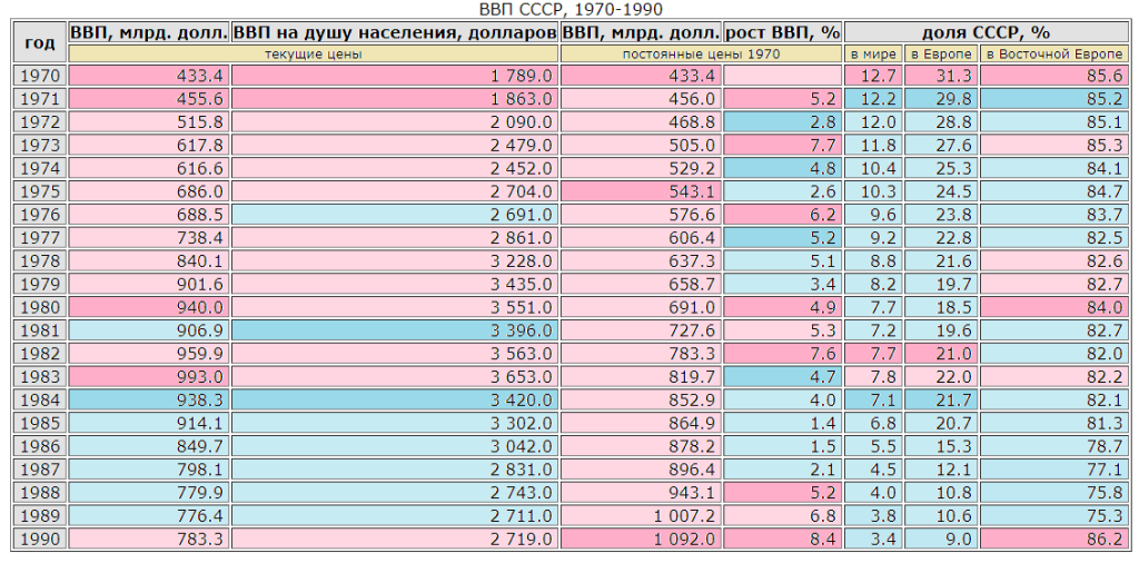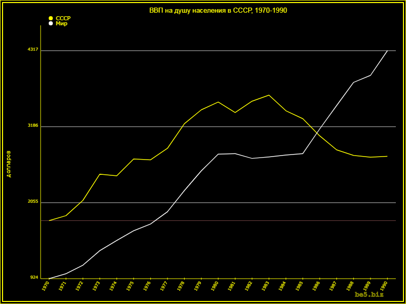 Когда вам говорят, что СССР мол занимал 12,7% от мировой экономики, это действительно так, только вот в 1970-м. В конце управления Брежнева мы стали всего 7,7% от мира, в 90-м году 3,4%.