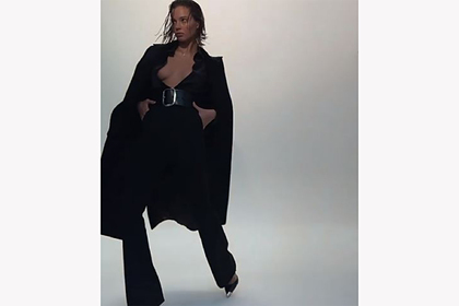 В серии из нескольких роликов, размещенных в аккаунте и сторис, 22-летняя манекенщица позирует в студии на светлом фоне в черном костюме. Ее образ состоит из расклешенных брюк, удлиненного жакета и расстегнутой рубашки, под которой нет нижнего белья. Наряд Кафельниковой дополняют широкий ремень, остроносые туфли-лодочки и укладка «мокрые волосы».