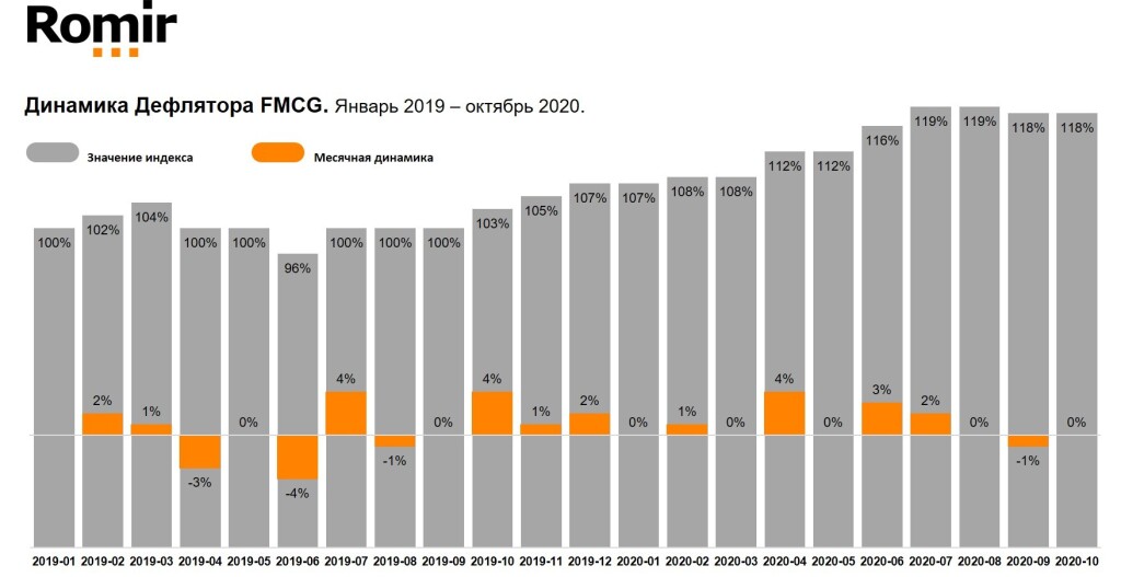 На конец октября-2020 годовая инфляция товаров категории FMCG составила 14%, при том что официальный индекс потребительских цен на этот месяц вырос на 3,99%, а продовольственная инфляция составила 4,83%.