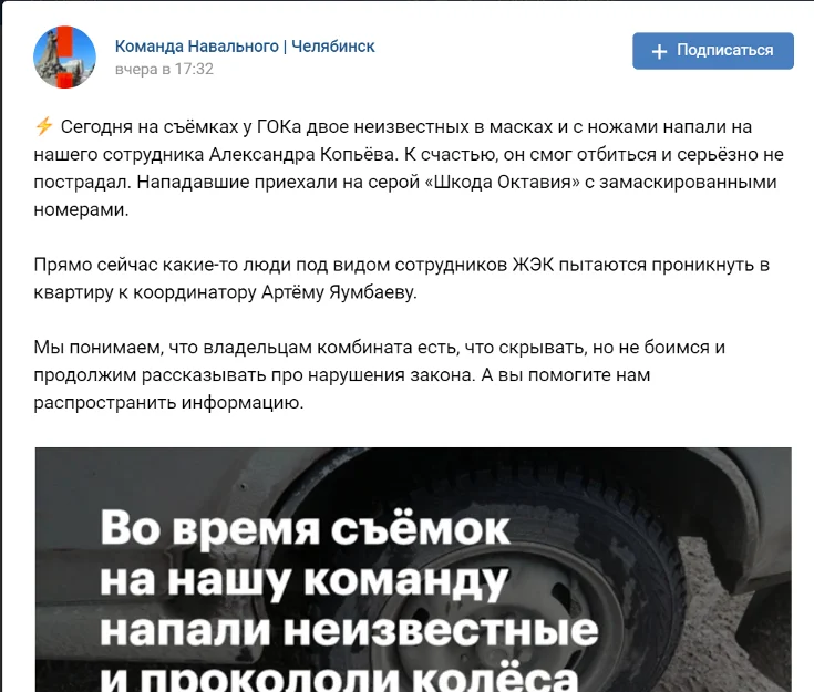 Координатор штаба Навального в Челябинске Артем Яумбаев, который занял эту должность в октябре 2020 года, заявил о нападении во время съемок у Томинского ГОКа.