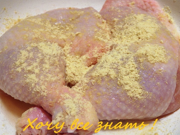 Для приготовления кушанья возьмем куриные окорочка. Помыв их, натираем хорошенько солью и посыпаем молотым имбирем. В таком виде отправляем курицу в холодильник, чтобы она промариновалась.