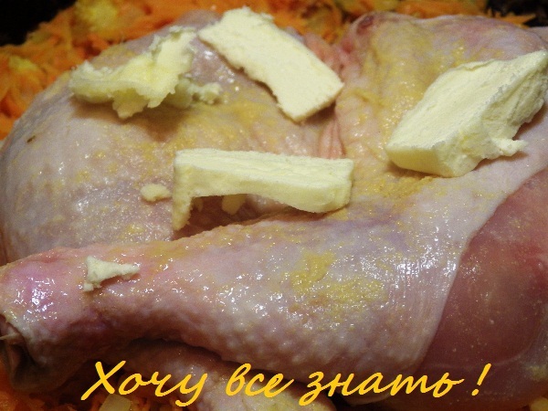 Выложив овощи в жаропрочную форму, достаем из холодильника окорочка. Кладем их на «подушку», а сверху на мясо нужно положить несколько кусочков сливочного масла.