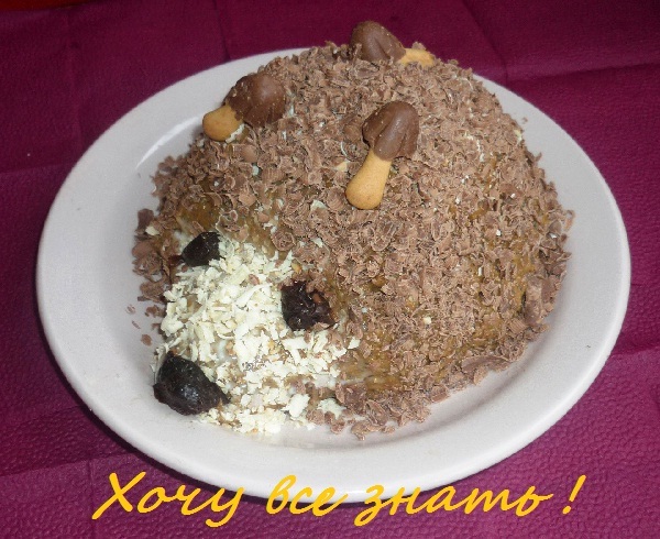 Белый и темный шоколад потереть на крупной терке. Белый распределить по мордочке ёжика, а темным покрыть оставшуюся часть. Сделать носик и глазки из чернослива или изюма, придумать другое украшение торта по желанию. Поставить на два-три часа в холодильник.