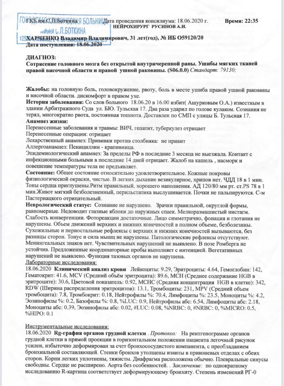 Харченко В.В. не может возбудить уголовное дело на своего обидчика. Он убеждает, что Ашурков О.А. совершил на него нападения прямо в коридоре суда. После чего Харченко В.В. был доставлен по скорой помощи в ГКБ им. С.П. Боткина, где ему диагностировали сотрясение головного мозга, ушибы мягких тканей правой височной области и правой ушной раковины (в распоряжении редакции имеются фото заключения врача), после чего был переведен для лечения НИИ Скорой помощи им. Н.В. Склифосовского. В результате Харченко В.В. больше месяца провел на больничной койке.
