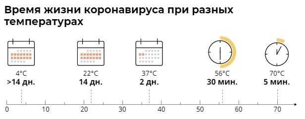 Сначала измерили стабильность SARS-CoV-2 при различных температурах. SARS-CoV-2 в среде переноса вируса (конечная концентрация ≈ 6·8 логарифмическая единица 50% - ной инфекционной дозы тканевой культуры [TCID50] на мл) инкубировали в течение 14 дней, а затем тестировали на его инфекционность (приложение Р 1). Вирус очень стабилен при температуре 4°C, но чувствителен к теплу. При температуре 4°С на 14-й день наблюдалось только снижение инфекционного титра на 0·7 логарифмических единиц. При повышении температуры инкубации до 70°С время инактивации вируса сокращалось до 5 мин.