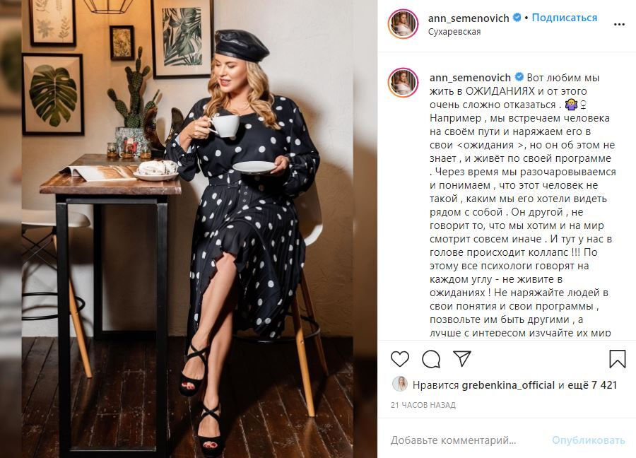 «Вот любим мы жить в ожиданиях и от этого очень сложно отказаться. Например, мы встречаем человека на своем пути и наряжаем его в свои „ожидания“, но он об этом не знает, и живет по своей программе. Через время мы разочаровываемся и понимаем, что этот человек не такой, каким мы его хотели видеть рядом с собой», — пишет в своем посте Семенович.