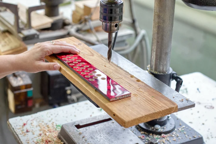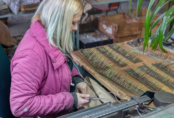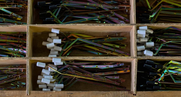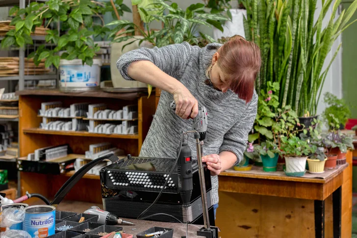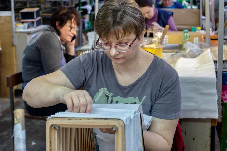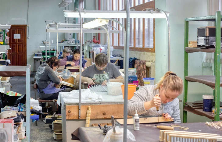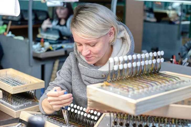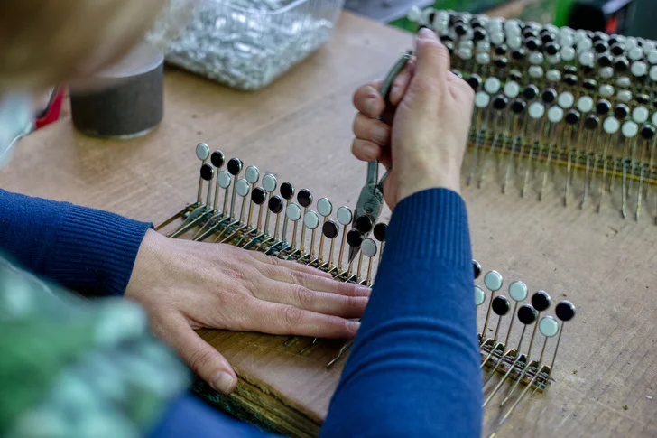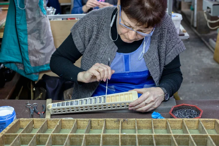 Наконец, корпус, гриф и басовые накладки попадают в цех сборки и настройки, где части соединяют и гармонь получает свой звонкий голос. Меха инструмента собирают из электрокартона, а к резонаторам приклеивают специальную планку с контролирующими движение воздуха клапанами, у каждого из которых своя тональность.