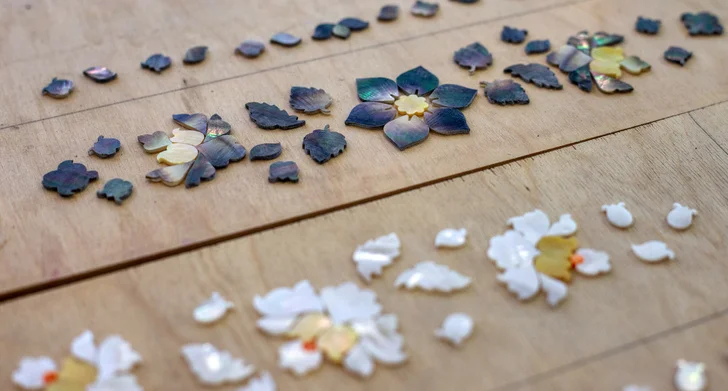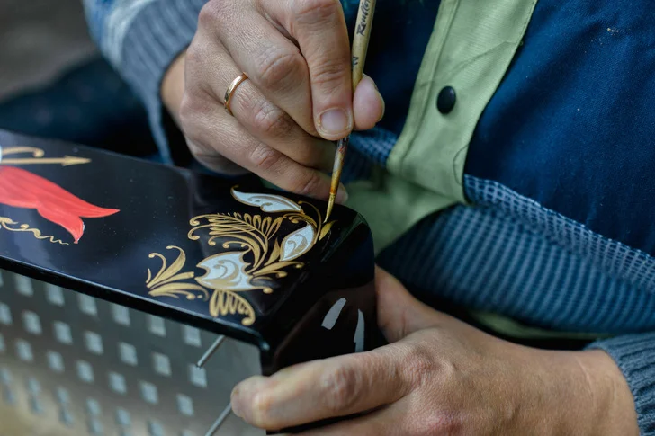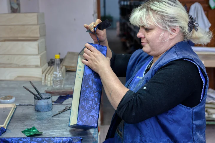 Поверхность заготовок вручную выравнивают столяры и, словно конструктор, собирают каркас левой и правой частей гармони. Затем их обклеивают тонким целлулоидом, вымоченным в специальном растворе и потому плотно прилегающем к деревянной поверхности. После недельной сушки верхнюю часть покрытия счищают железными пластинами и полируют для придания глянца. На блестящем корпусе художник наносит роспись трафаретными красками, чаще всего на гармонях рисуют цветы.
