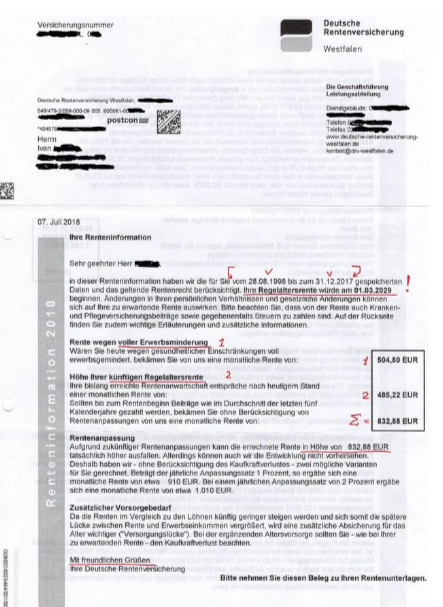 Немного о нашей жизни в Германии! Мне сейчас 58! Я 1962 года рождения! На пенсию в Германии я по закону выйду в 66 лет и 8 месяцев! Т.е. 1 марта 2029 года! ПЕНСИЯ! Немецкая! Покажу скан последнего письма из немецкого пенсионного фонда, в котором видно, что в случае полной невозможности работать до достижения пенсионного возраста, я получу 504 евро 80 центов пенсии. Размер же заработанной мной по старости пенсии, при условии, что доживу, доработаю и буду столько же зарабатывать - 485 евро и 22 цента!