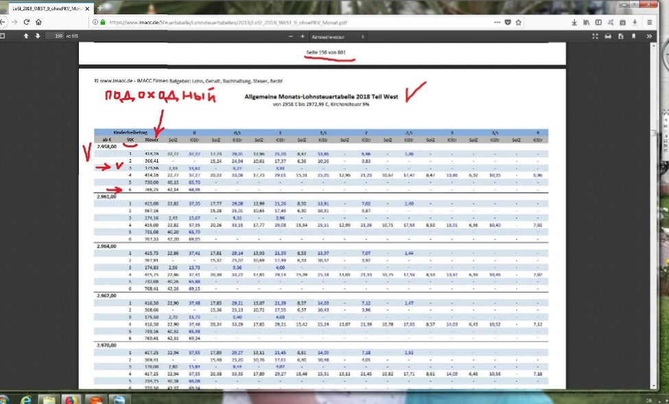 Ну и добавлю как вишенку на торт о немецких классах налогообложения! Их существует 6! Размеры подоходного налога сильно разнятся: от нуля % - в зависимости от размера зарплаты - до 45 % от начисленной зарплаты! Опять же покажу на примере, т.е. на скрине официальной таблицы исчисления подоходного налога для физических лиц. Максимальная ставка подоходного налога в Германии 45 %! При том, что такая ставка применяется к ГОДОВОМУ доходу выше 260 тысяч евро, т.е. если у человека 300 тысяч евро дохода в год, то с 260 тысяч он заплатит 42 % подоходного и лишь с 40 тысяч 45 % подоходного! А с годовых доходов выше 55-ти тысяч евро и до 260 тысяч в Германии применяется ставка в 42 % подоходного! Основная масса народу имеет годовой доход от 9-ти тысяч до 55-ти тысяч евро и они платят прогрессивный подоходный налог от 14 % до 42 %!