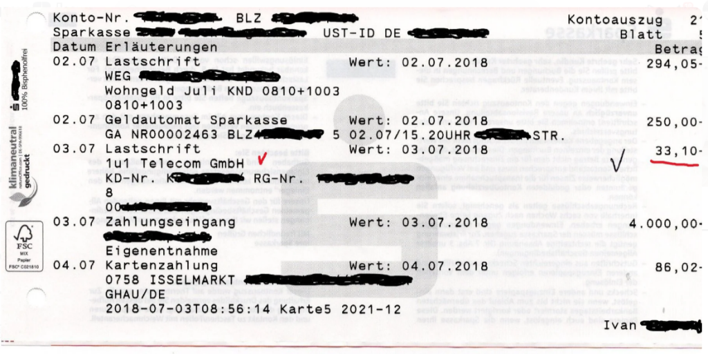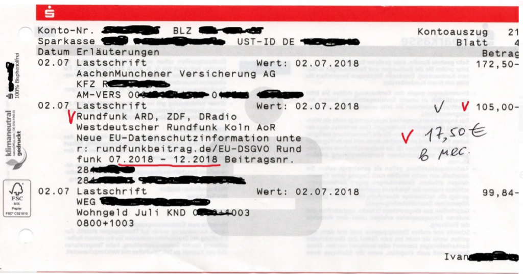 Потом по факту, либо сэкономленная сумма будет засчитана при новом платеже, либо надо будет доплатить, если потребление окажется выше. На пятом скане платёжка за интернет и телефон - 63 евро 64 цента. На шестом - плата за два мобильных телефона - 33 евро 10 центов. На седьмом сбор или налог на телевидение - 17 евро 50 центов в месяц! На сканах я сделал пометки - куда смотреть! Кстати говоря, лень уже искать документы по обязательным страховкам на квартиру, налог на имущество и даже предписанную по немецкому закону установку противопожарной сигнализации. Я показал специально размеры платежей и размер будущей пенсии.