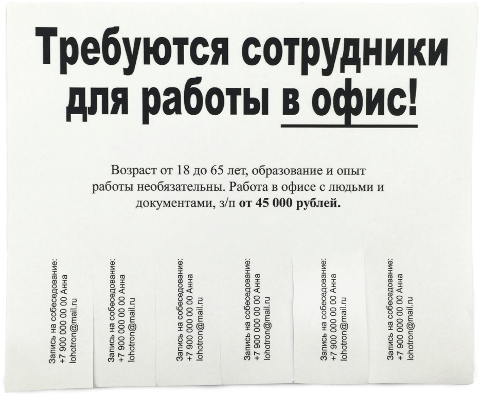 По объявлению в газете вы находите агентство, которое обещает пристроить вас на высокооплачиваемую работу. 2000 Р — и вы счастливый обладатель эксклюзивного списка вакансий с адресами и телефонами богатых фирм: госкорпораций, международных фирм, мировых брендов и даже госструктур.