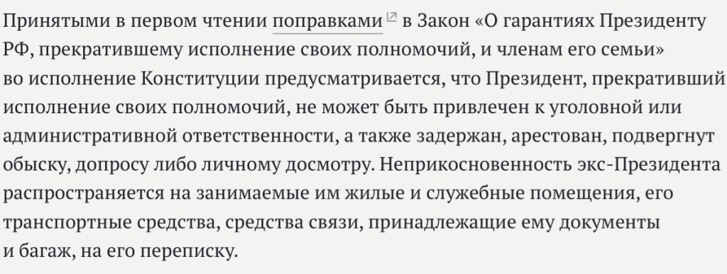 Кроме того, депутаты Госдумы РФ в 1-ом чтении одобрили законопроект о гарантиях неприкосновенности бывшим президентам России и их семьям, сообщается на сайте нижней палаты. http://duma.gov.ru/news/50030/