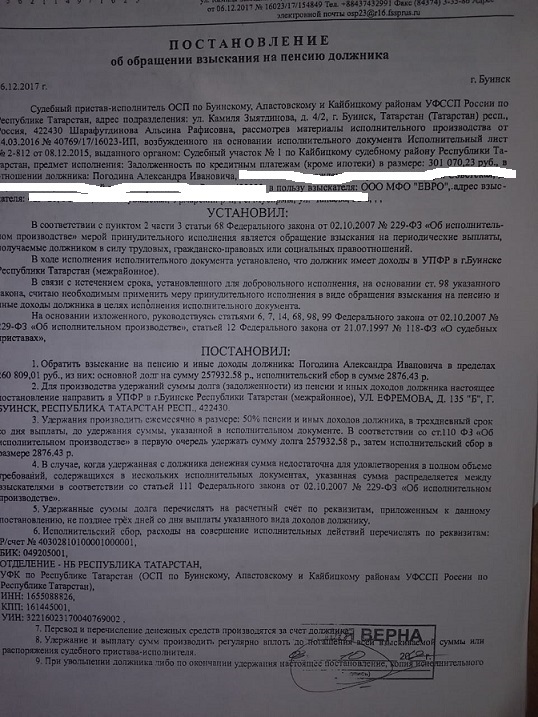 То есть своим решением постановила взыскать с проценты, обязанность которых еще не наступила, и не указав их сумму. На это она, конечно, не имела права, что не помешало судебному приставу исполнителю посчитать, что проценты начисляются на постоянной основе вне зависимости от уже оплаченных сумм, и после взыскания установленных сумм по решению суда, он в 2017 г. выносит постановление о взыскании еще 250000. На данный момент они взысканы полностью, а на днях мне звонит жена должника и сообщает о том, что в Пенсионный фонд пришло еще одна бумага о взыскании еще 300000 руб.