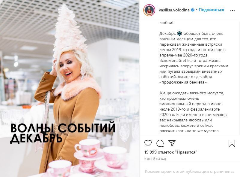 Телеведущая Василиса Володина опубликовала для своих подписчиков в Instagram**** прогноз на последний месяц уходящего 2020 года. Она рассказала, для кого декабрь станет судьбоносным месяцем.