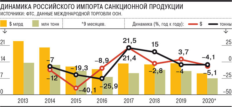 Глава Национальной мясной ассоциации Сергей Юшин говорит, что если в 2000-х годах Россия ввозила 2,5–3 млн тонн мяса и субпродуктов, в том числе из ЕС, то в 2020 году — менее 600 тыс. тонн. В этом году в стране будет выпущено 5,05 млн тонн мяса птицы и 4,25 млн тонн свинины, хотя десять лет назад эти показатели составляли 0,8 млн и 1,6 млн тонн, поясняет эксперт.