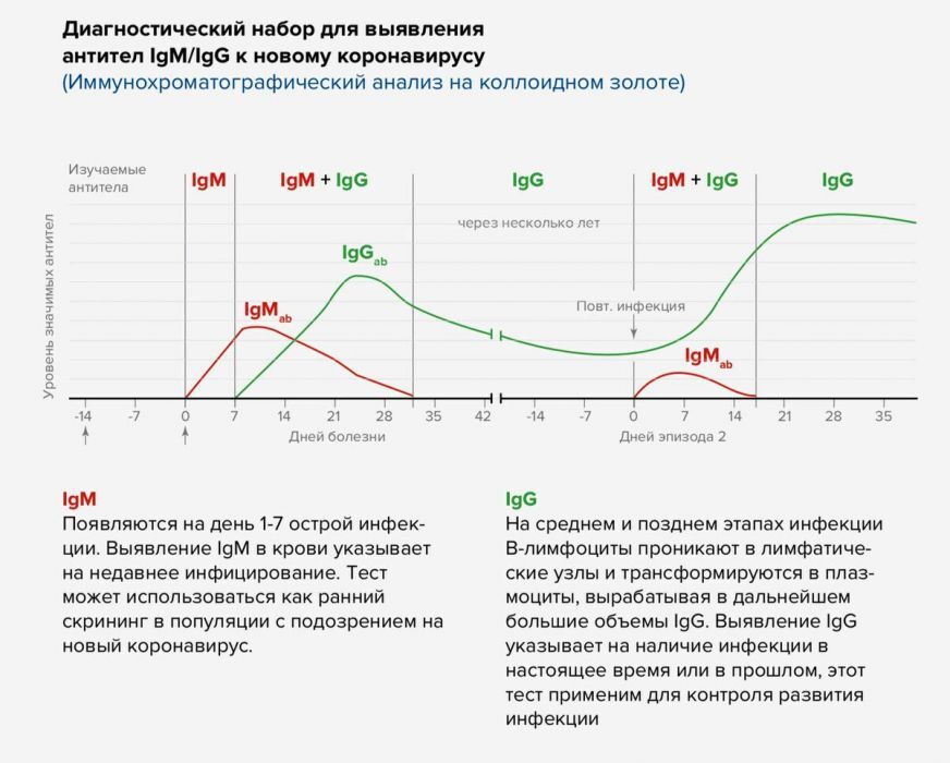 Протестироваться на антитела lgM можно и во время заболевания, поскольку они начинают вырабатываться на 5-7 день после попадания вируса в организм. Однако при Sars-CoV-2 антитела иногда появляются позже – через неделю, а то и две.