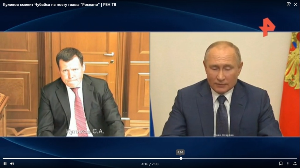 Скриншот видео разговора Путина В.В. и Куликова С.А. по поводу назначения последнего руководителей "Роснано", размещённого на сайте РенТВ