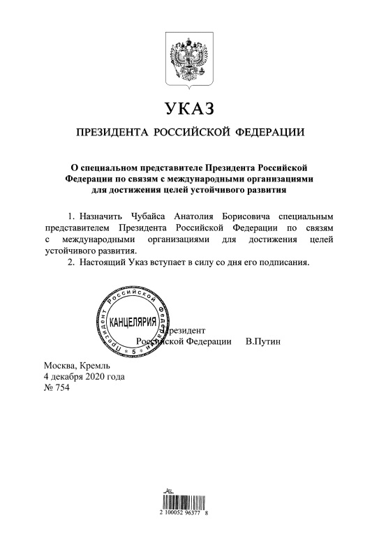 Итак, как объявлено, Чубайс А.Б. указом за подписью Путина Владимира Владимировича назначен спецпредставителем Президента Российской Федерации по связям с международными организациями для достижения целей устойчивого развития. О чём и появилась информация на Официальном интернет-портале правовой информации и даже файл выложен с копией указа № 754 от 4 декабря 2020 года.