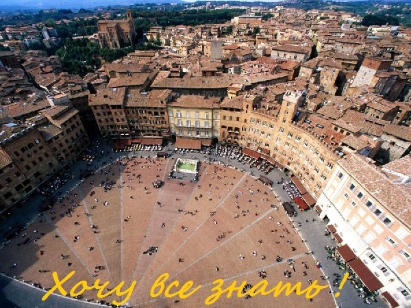 1. Пьяцца дель Кампо — это центральная площадь Сиены. В старину там разворачивали рынки, справляли праздники, устраивали скачки. Эти традиции сохранились и по сей день. Можно посмотреть скачки Палио в начале июля и середине августа. Благодаря уклону, на площади можно удобно сидеть прямо на земле. Фасады домов украшены в стиле средневековья. А в самих домах есть сувенирные лавки.
