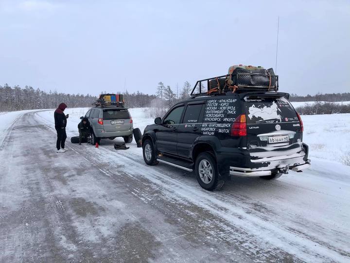 Из путевых записей: «Сейчас, уже узнав больше информации, я понимаю, что вытянул лотерейный билет. Шансы уехать до Магадана у меня равнялись примерно нулю. На трассе есть переправа через реку Алдан, и она пока не функционирует… Машины на мою поднятую руку не реагируют. Все едут куда-то недалеко. Нахожу в интернете номер региона Магадана: 49. Даю себе еще полчаса и готов после этого ехать обратно в Якутск и лететь оттуда домой. Ноги уже замерзли. И тут в ситуацию вмешивается мой бог путешественника: едут два джипа, у первого на номерном знаке указан регион 49. Практически кидаюсь им под колеса, и они меня подбирают».