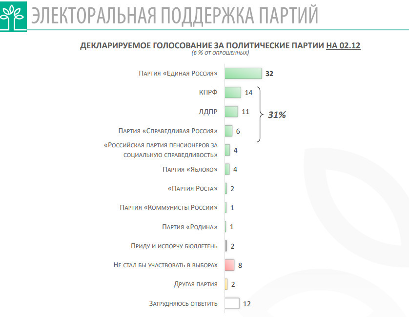 При этом каждый пятый собеседник государственной службы социологии либо не пойдёт на выборы, либо не имеет ответа. 12% не смогли определиться с выбором актуальных политиков, а 8% не готовы участвовать в парламентских выборах. Портить бюллетень готовы лишь 2% избирателей.