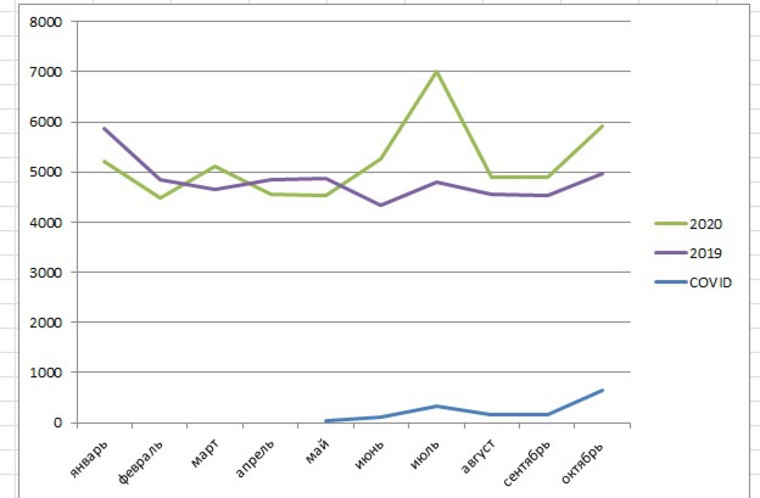 Согласно данным Росстата, в октябре 2020 года в регионе умерло 5918 человек. При этом за тот же период 2019 года скончалось 4959 свердловчан. Из числа умерших в октябре 637 человек имели диагноз COVID-19, то есть каждый девятый из умерших.