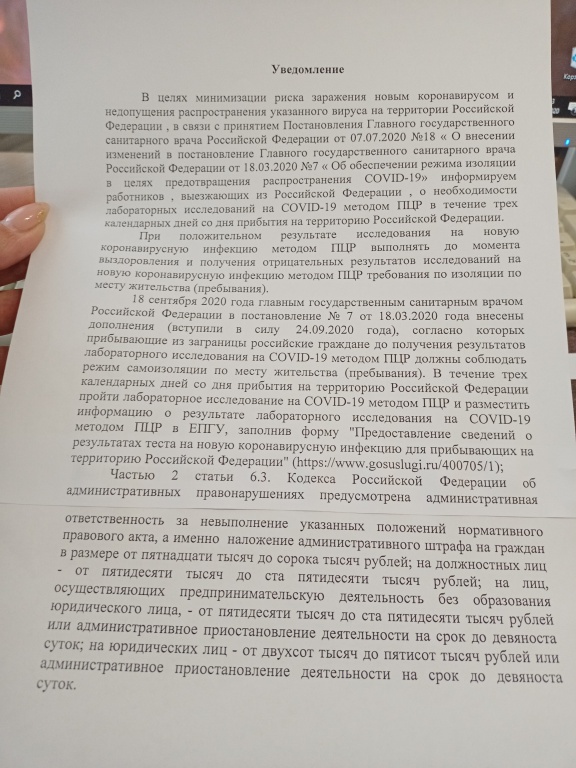 Согласно решению Главного государственного санитарного врача РФ Анны Поповой с сегодняшнего дня граждане России, прибывшие из-за рубежа авиарейсами и прошедшие лабораторное исследование на COVID-19 методом ПЦР, которое они обязаны сделать в течение трех дней со дня прибытия в Россию, обязаны соблюдать режим самоизоляции по месту жительства (пребывания) до получения результатов указанного исследования.