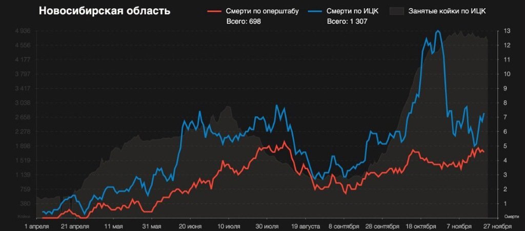 Недавнее расследование «Медиазоны» показало, что Новосибирская область входит в перечень регионов, оперштабы которых публикуют заниженные данные о смертности, умножая их на определенный коэффициент. По данным на 27 ноября, умерли не менее 1 307 новосибирцев, в то время как штаб отчитывался о гибели 698.