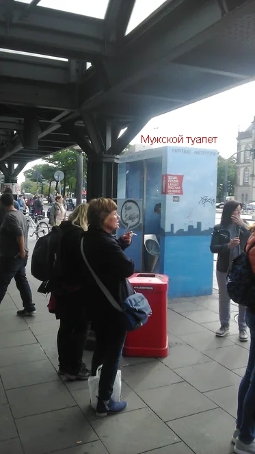 А ещё в Гамбурге отдельная тема уличные туалеты. Если это кабинки, то там даже мужчин просят сесть на унитаз, чтобы не разбрызгивать (фото 4). А на улице, стеклянные кабинки практически ничего не скрывают: мужчины писают, дамы равнодушно смотрят и курят (фото 5, хауптбанхофнорд). Ну, почти, как в бане: неэмоционально!