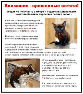 Предприимчивые граждане давно сообразили, как невзрачного беспородного котенка сделать более привлекательным. Рентабельность обычной кошки повышается в десятки раз, если ее покрасить анилиновым красителем. Годятся для этого только черные котята. Их высветляют целиком, оставляя нетронутыми только мордочку и лапки, а потом красят в нужный цвет химической краской. Если все сделать аккуратно, то котенок вполне сойдет за клубного. Специалист, конечно, сразу разглядит в нем подделку, но специалисты не покупают породистых животных в подземном переходе за 600 рублей. Так можно обмануть только домохозяек в преддверии праздника.