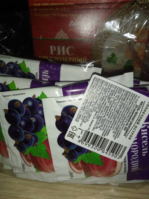 Кисель "Черная смородина" 20 пакетиков по 30 грамм. Один пакетик рассчитан на 1 стакан. Цена 76 рублей.
