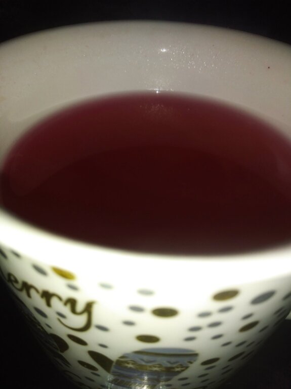 Вот что получилось в чашке. Запах, вкус и цвет абсолютно натуральные. Фото мутное, потому что кисель горячий и от него идет пар)