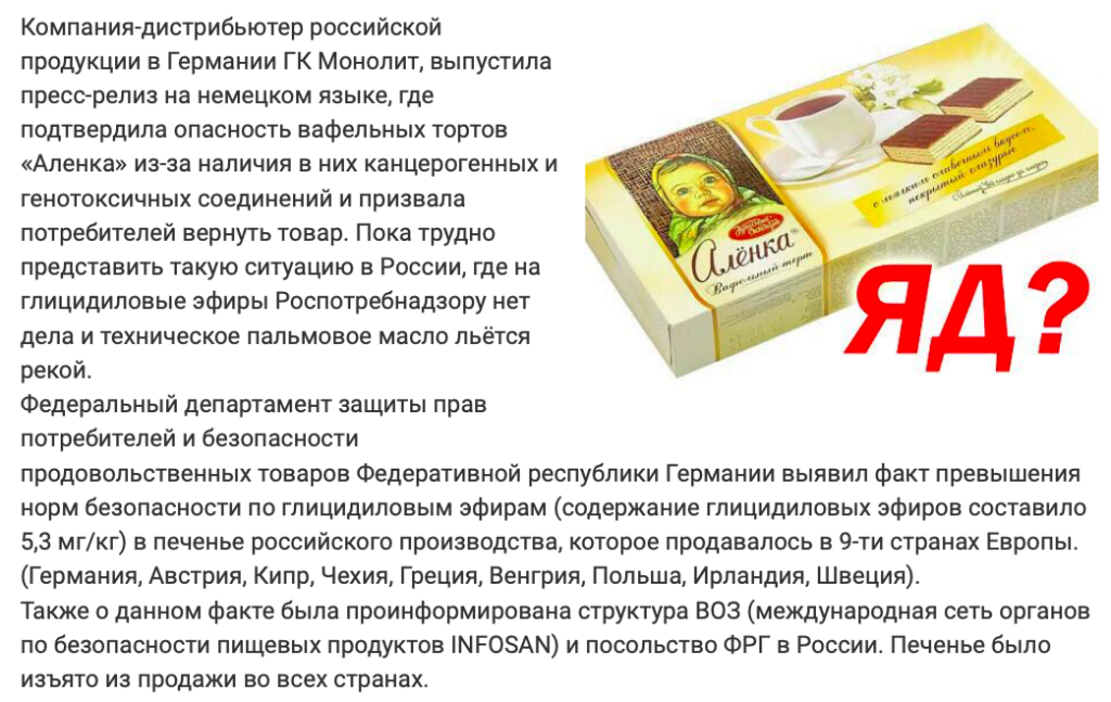 Поскольку у нас в ЕАЭС все нормативы, в том числе и по продуктам питания приводят к единым нормам, то как ни странно, вопрос о пределах допустимого подняла маленькая Киргизия. Однако масложировое лобби отложило принятие закона, который ограничивает ввоз технического пальмового масла на 14 месяцев.Сейчас у нас в стране не запретили выпуск торта "Алёнка", а это значит, что всё, что производится на экспорт, теперь пойдёт на наш внутренний рынок, то есть на прилавки наших российских магазинов (!). Следовательно всеми этими конуерагенами, вызывающие раковые заболевания, будут травить нас с вами и наших детей...