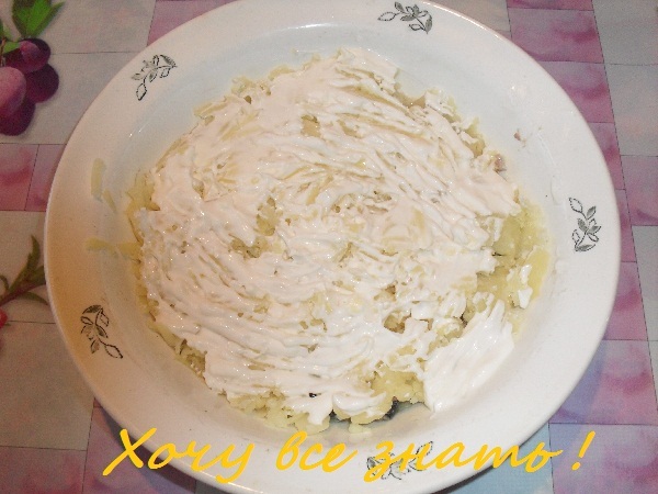 -Поверх рыбы на крупной тёрке натереть картофель, немного намазать майонезом.