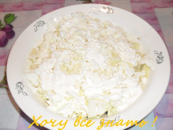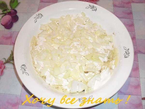 -У отварных яиц отделить белки. Натереть белки крупно поверх лука на тёрке, слегка посолить и тоже немного помазать майонезом.