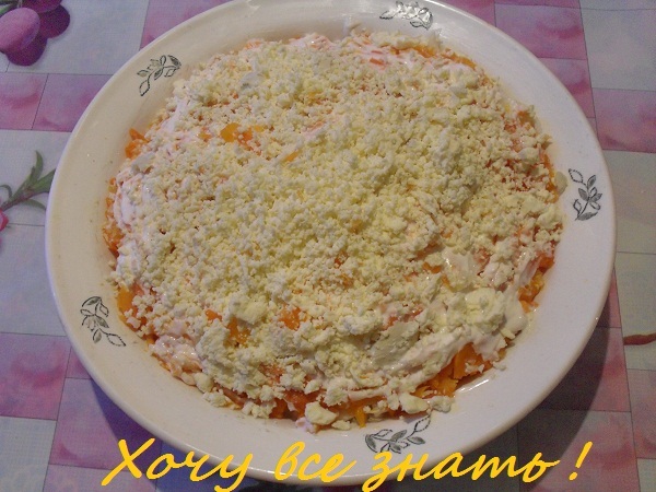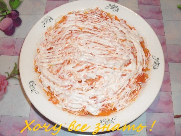 -На крупной тёрке натереть морковь, распределить её по белковому слою. Опять нанести майонез.