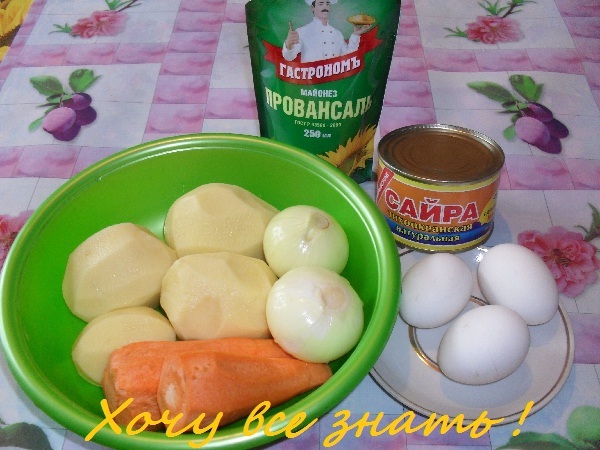 -Отварить в подсолёной воде картофель, морковь и яйца, всё остудить и почистить.