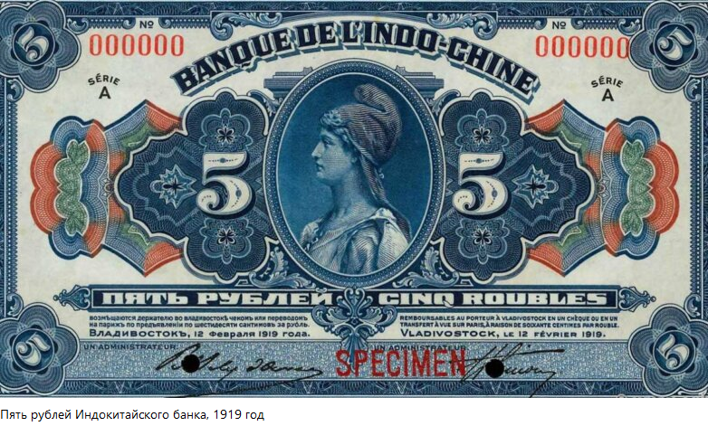 Париж приступил к созданию своих рублей, несмотря на возражения Колчака. Купюры номиналом от 5 до 500 руб. выпускались от имени Banque de l’Indochine, Индокитайского банка (уже имевшего опыт эмиссии денег для французских колоний Вьетнама, Камбоджи и Лаоса). Такие roubles несли надписи на двух языках, русском и французском, с указанием на фиксированный курс – «шестьдесят сантимов за рубль». Прежде, до мировой войны и всех революций, курс был совершенно иным (почти 300 сантимов за 1 руб.), но на фоне российской междоусобицы всё изменилось.
