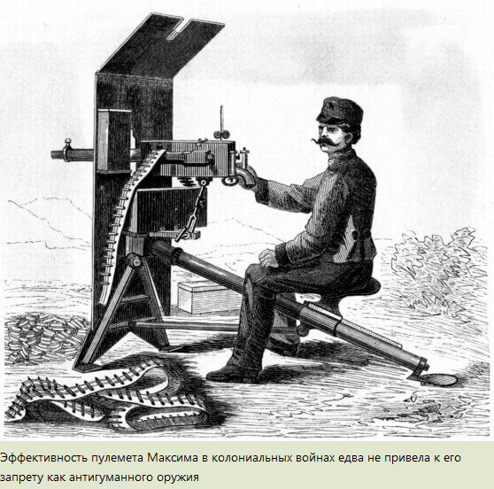 Опыт применения «максимов» в колониальных войнах ужаснул тогдашних правозащитников, и они пытались добиться его запрета как оружия массового поражения. Но, в отличие от сомнительных «мягких» пуль, «машинка смерти» Хайрема Максима работала слишком хорошо, чтобы кто-то позволил ее запретить.