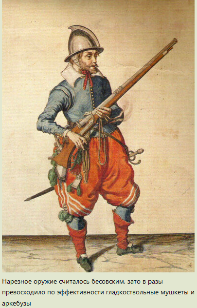 Огнестрельное оружие с его пламенем, дымом и грохотом неминуемо должно было вызвать подозрение церкви. Удивительно, что это случилось довольно поздно, в XVI веке, когда появились первые нарезные стволы. Такие ружья (термин «винтовка» еще не придумали) были очень редки и дороги, но их смертоносная эффективность так впечатлила современников, что стала поводом к религиозному диспуту. Действительно, а почему это вращающаяся пуля летит в цель точнее обычной? Кто-то ее направляет… Кто?