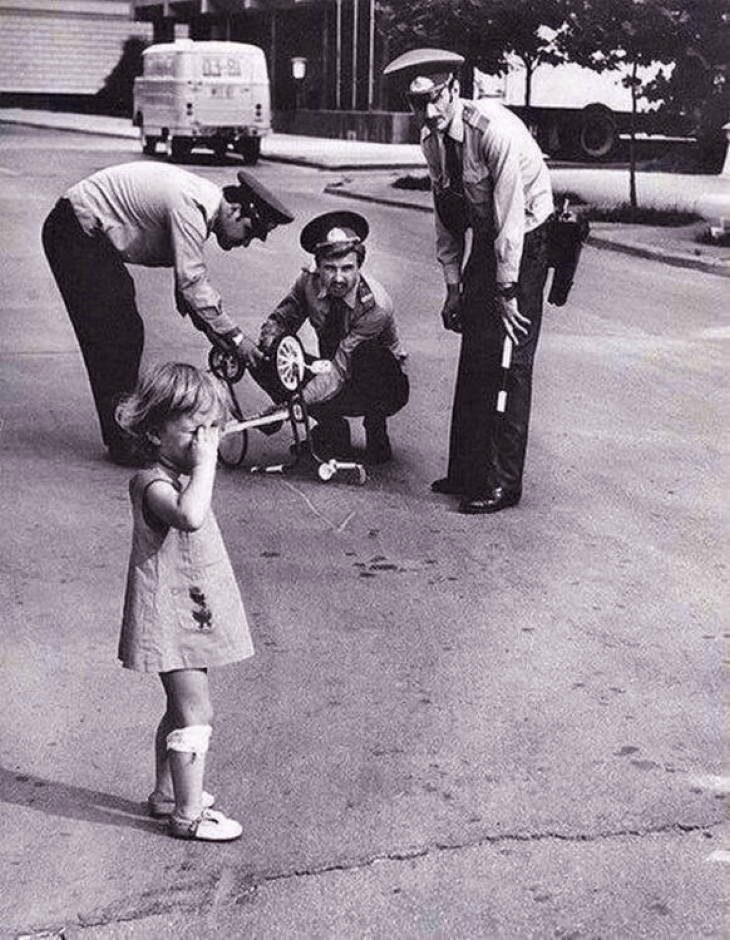 Историческое фото, которое отражает действие милиционеров в нестандартной ситуации.