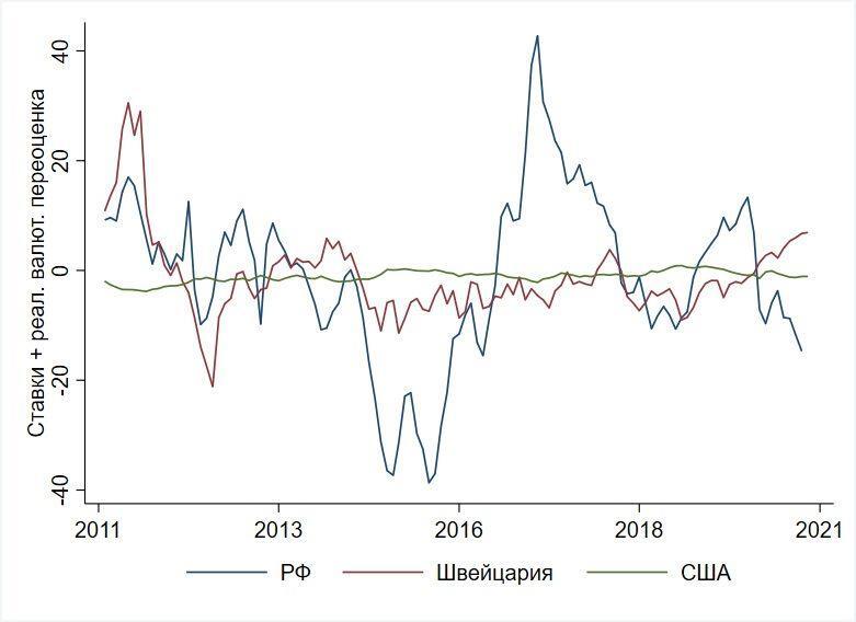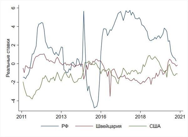 Если вычесть инфляцию из номинальной процентной ставки, мы получим реальный процент – доходность сбережений с учетом инфляции. Как по этому параметру соотносится Швейцария с другими странами показано на графике ниже. (Расчеты выполнены мною с помощью данных CEIC.)